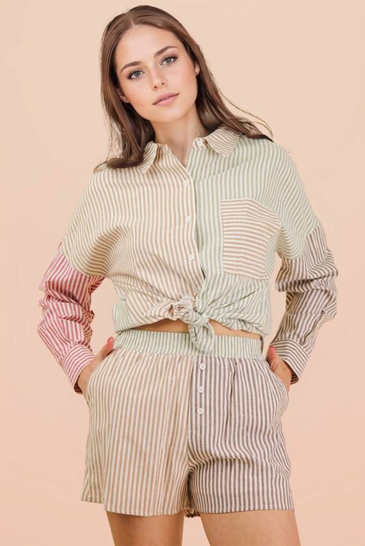 Stripe Color Block Shirt Top & Shorts Set: MOCHA MIX