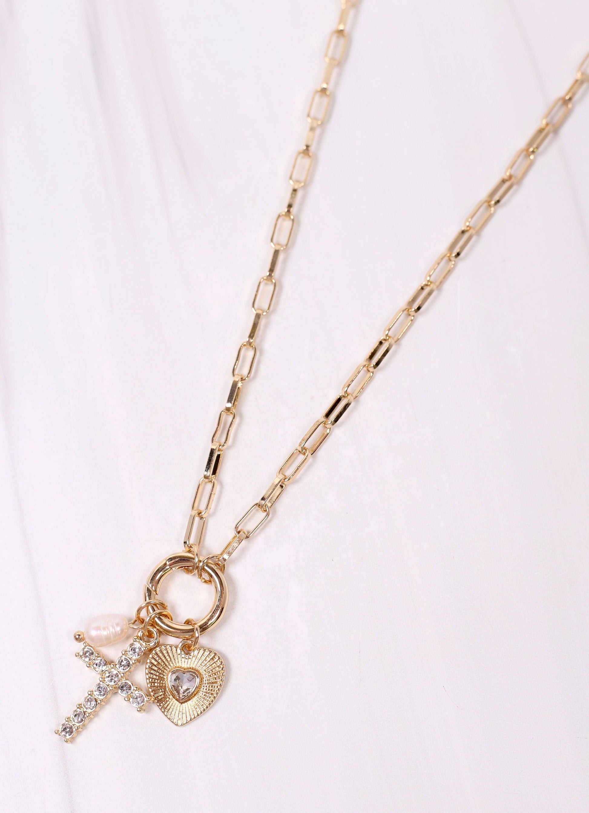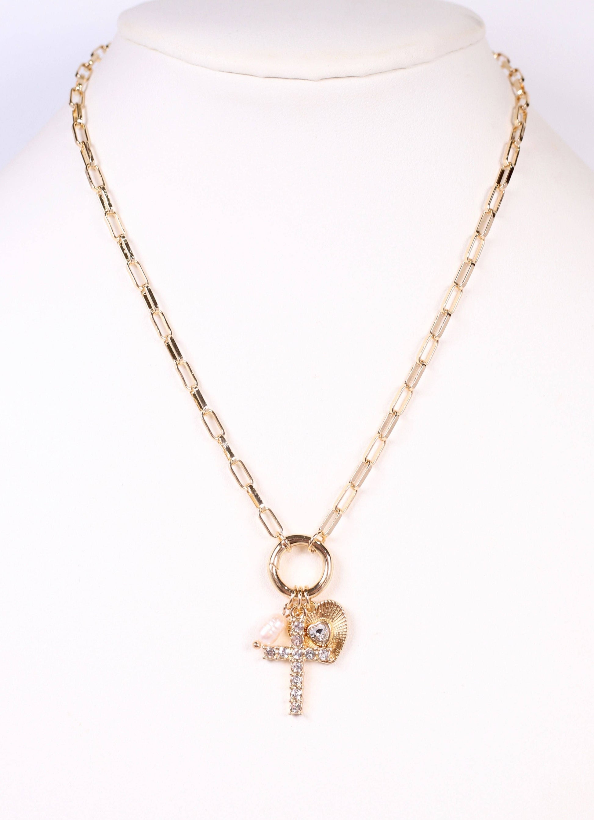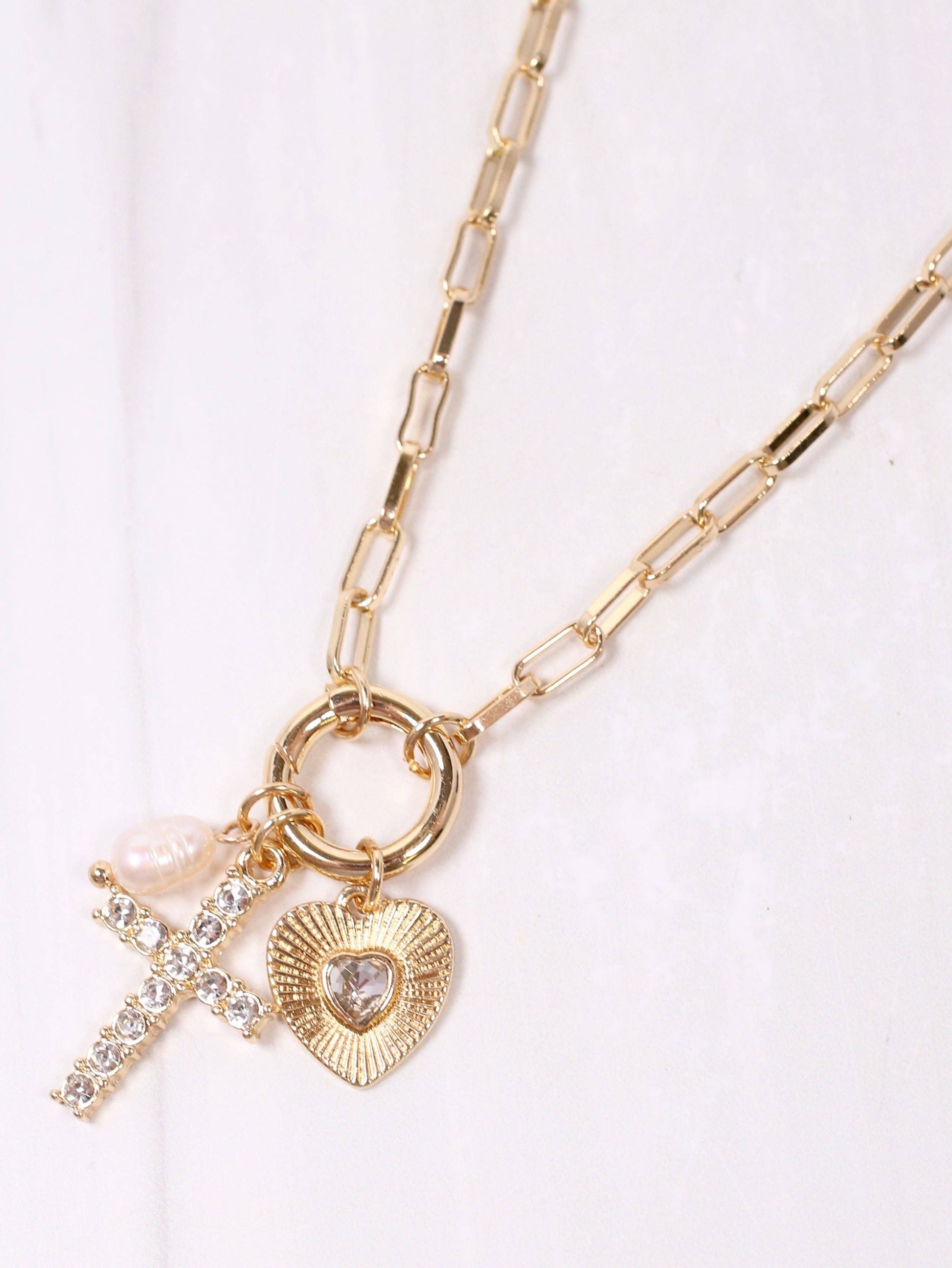 This shiny link necklace features a charm cluster that is so cute. It has an open circle ring in the center with three charms attached- a freshwater pearl, CZ lined cross, and a heart with CZ.