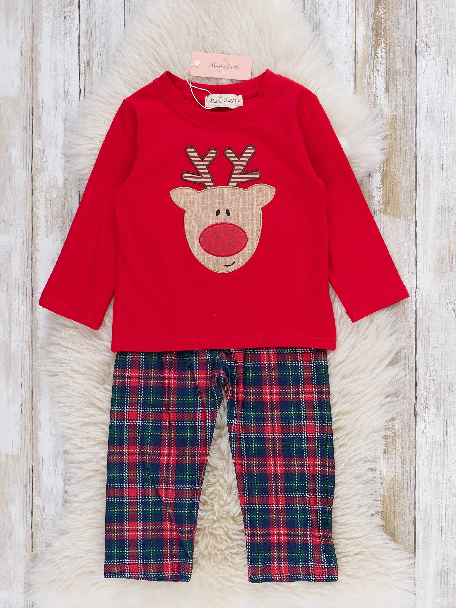 The Big Red Nose Rudolph Embroidered Outfit glows like Rudolph's nose! Bright red paired with tartan pants, this two-piece set is adorably festive for the holidays with its embroidered reindeer. Also made with soft, comfortable fabric, your little boy will love this romper during the winter days and Christmas time.