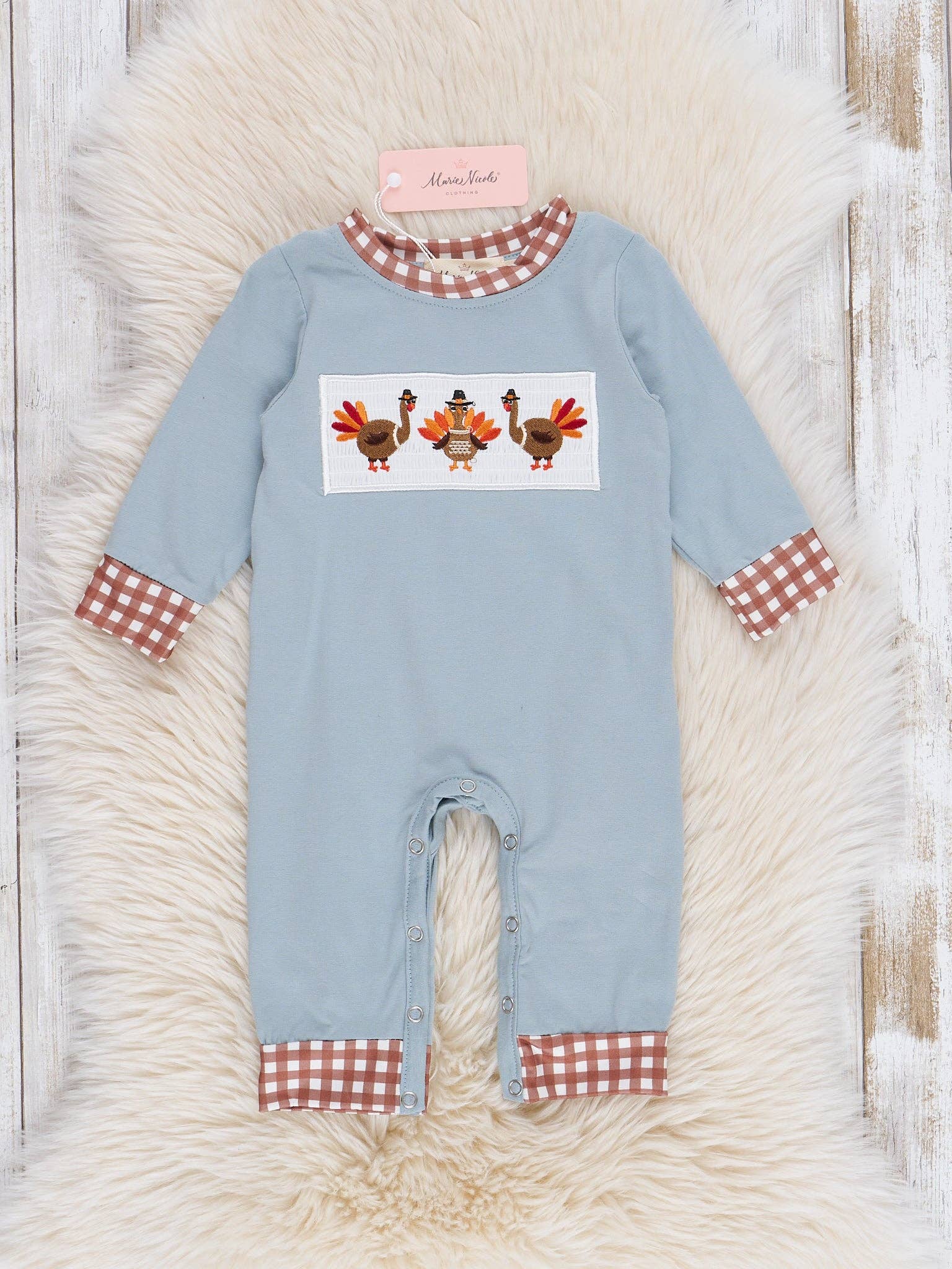 Dusty Blue & Brown Gingham Smocked Turkeys Romper