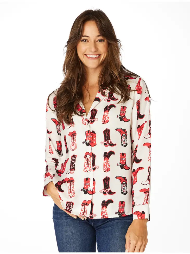 The Boots Button-Up blouse features cowboy boots in your favorite team’s colors and school logo. The scatter print on this blouse shows off your modern rodeo style. This shirt has so many possibilities and can be worn open over a tank, buttoned up and tucked into jeans, or tied at the waist with jean shorts. This shirt is officially licensed by the University of Georgia. A portion of sales directly supports the university.