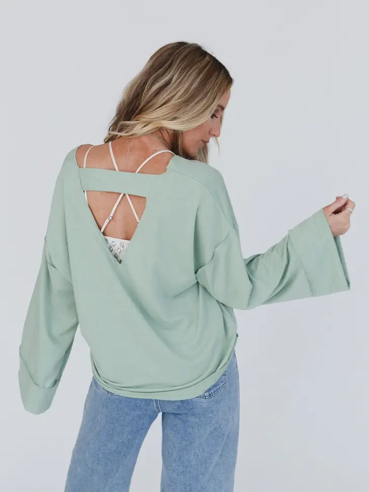 * So cozy, french terry, stretch fabric * Loose and relaxed silhouette * Flattering v neckline * Oversized and roomy long sleeves * V back with strap support * Raw seams throughout for added style Both comfy and cute outfit pair with: Tattoo Bralette, So Comfy Wide Leg Pants, Kasia Layered Necklace *Due to lighting and differences in monitors, actual colors may vary slightly from what appears online.