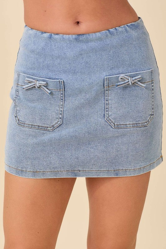 This playful mini denim skort combines the casual charm of denim with a flirty ribbon bow detail for a fun, feminine touch. Featuring a convenient front pocket, it’s perfect for keeping essentials close while adding a stylish twist to your everyday look. Ideal for sunny days and spontaneous adventures!