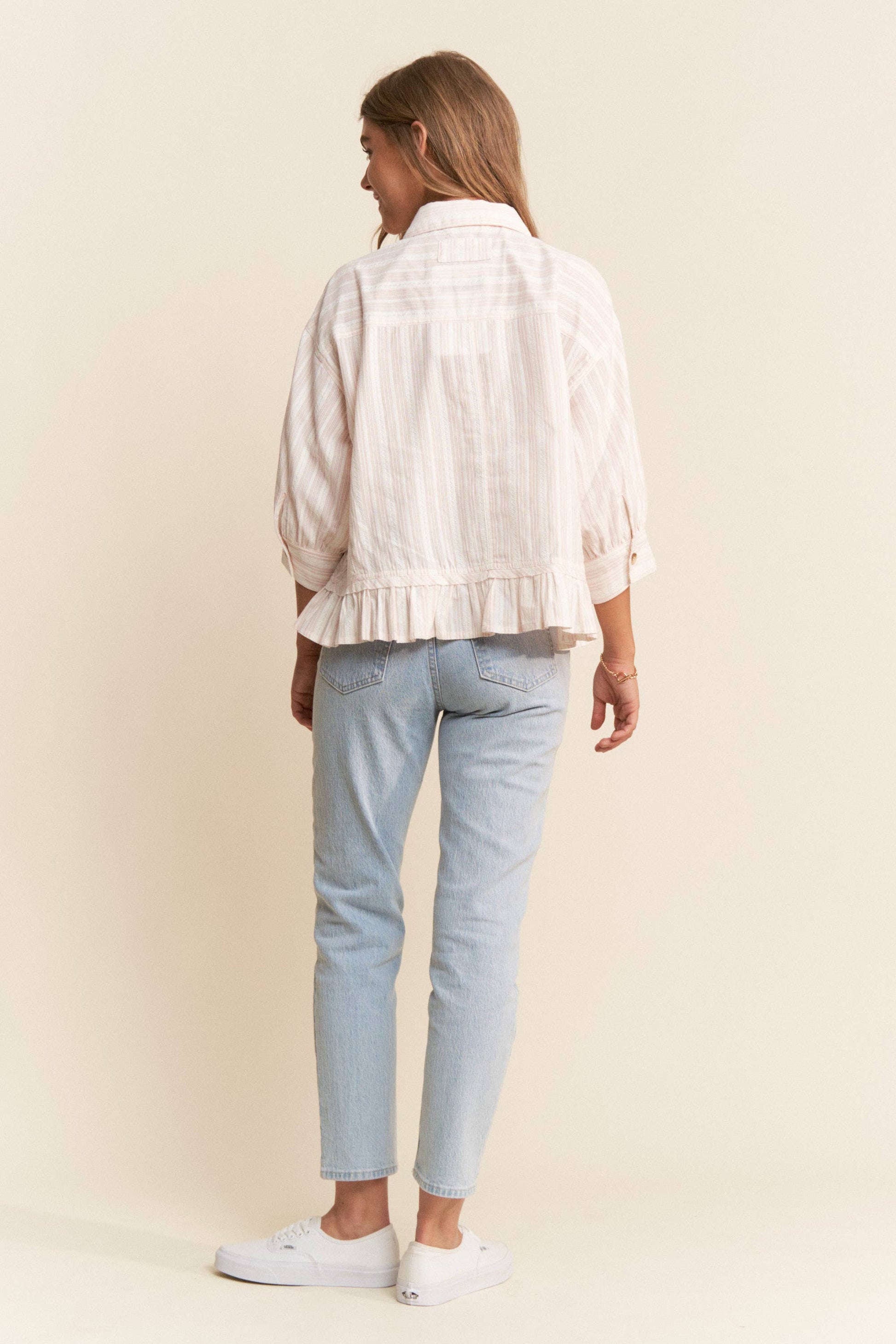 Women's striped button up jacquard pattern 3/4 sleeve. Pleated peplum bottom hem.