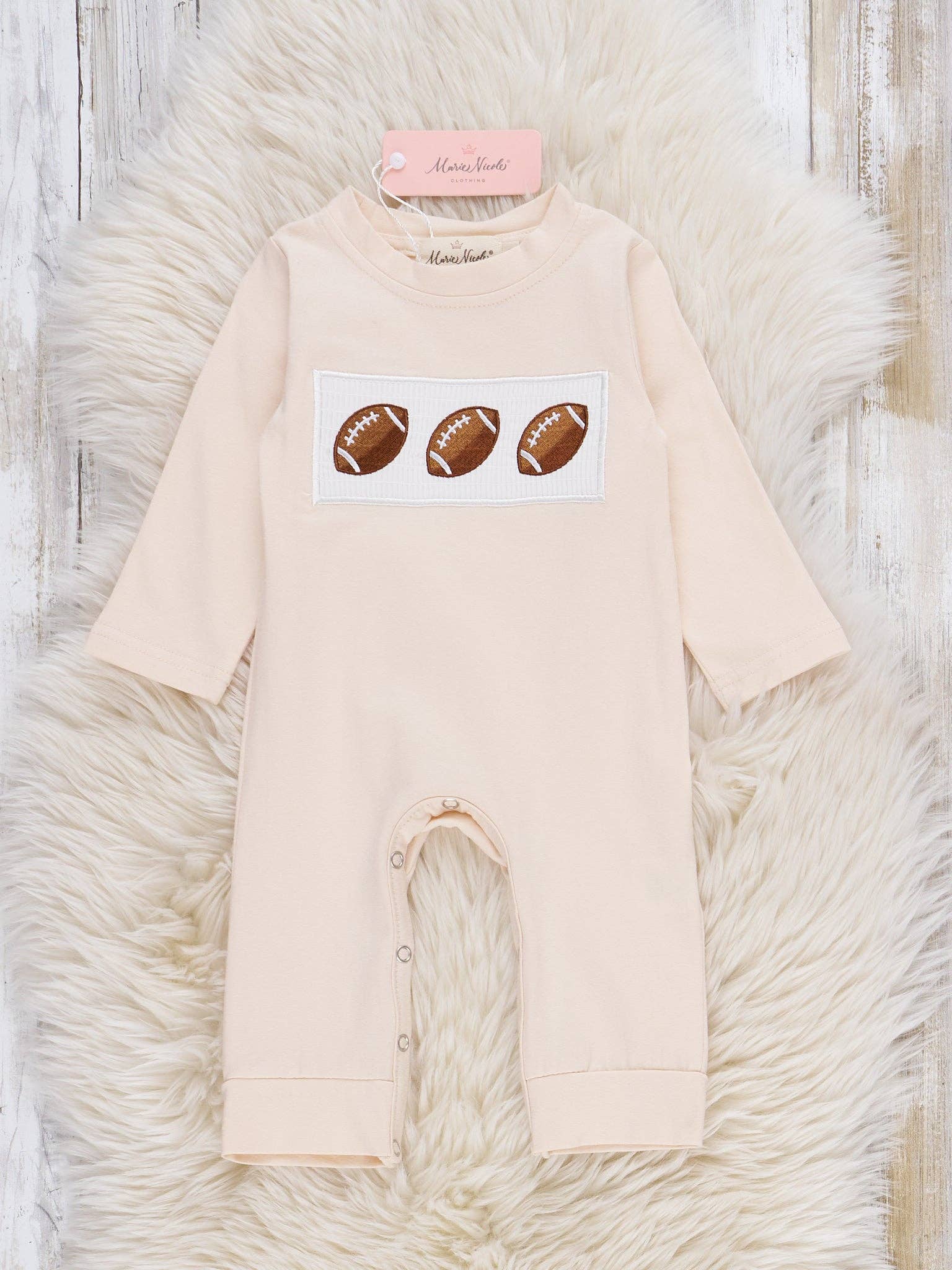 The Tan Football Time Smocked Romper is a charmingly simple piece that lets football stand out! With the bodice smocked and embroidered with footballs, it is the ideal piece for any football lovers. Crafted with soft fabric, this one-piece from Marie Nicole Clothing is comfy and perfect for your little one.