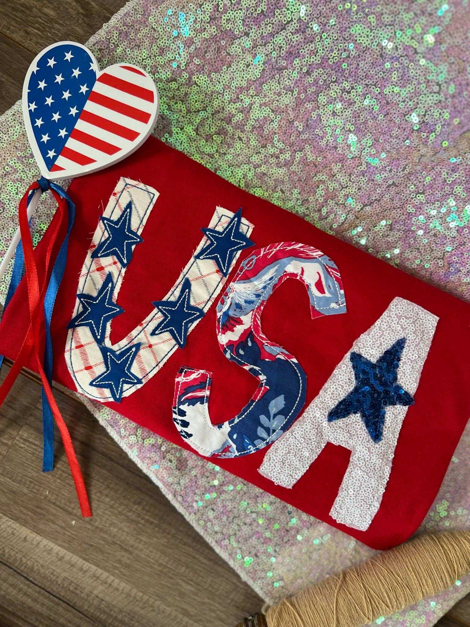 Mixed fabric applique. Floral Fabric design may vary depending on availability.